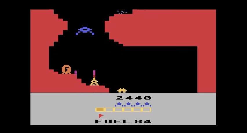 Caverns is similar to Scramble, except the action is vertical, rather than horizontal. The idea of the game is that Martians are surrounding Terra IV (your planet) and you must defeat the Martian forces by sabotaging their defense system. The goal of Caverns is to guide your ship to the bottom of the cavern, while avoiding enemy fire and laser gates. There are four types of enemies that you can shoot to gain points: transmitters, creon rockets, pyxias rockets, and space mines. You can also shoot fuel tanks, which will give you additional fuel. If you are good enough to navigate your way to the bottom of the cavern, you must land on the fusion bomb, activate it, and escape from the cave before it explodes!